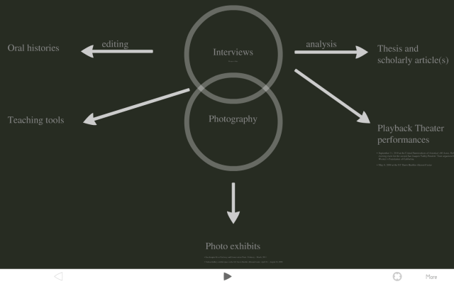 Nonetheless, I was excited to see a different kind of software in action for the first time at a recent conference, and used it in a presentation of my own on Friday. Prezi let’s you create one big canvas and zoom around on it to focus on different aspects of what you want to say. Your presentation lives online so you can access it from any computer with an internet connection, and you can e-mail people a link to your presentation for them to view on their own.