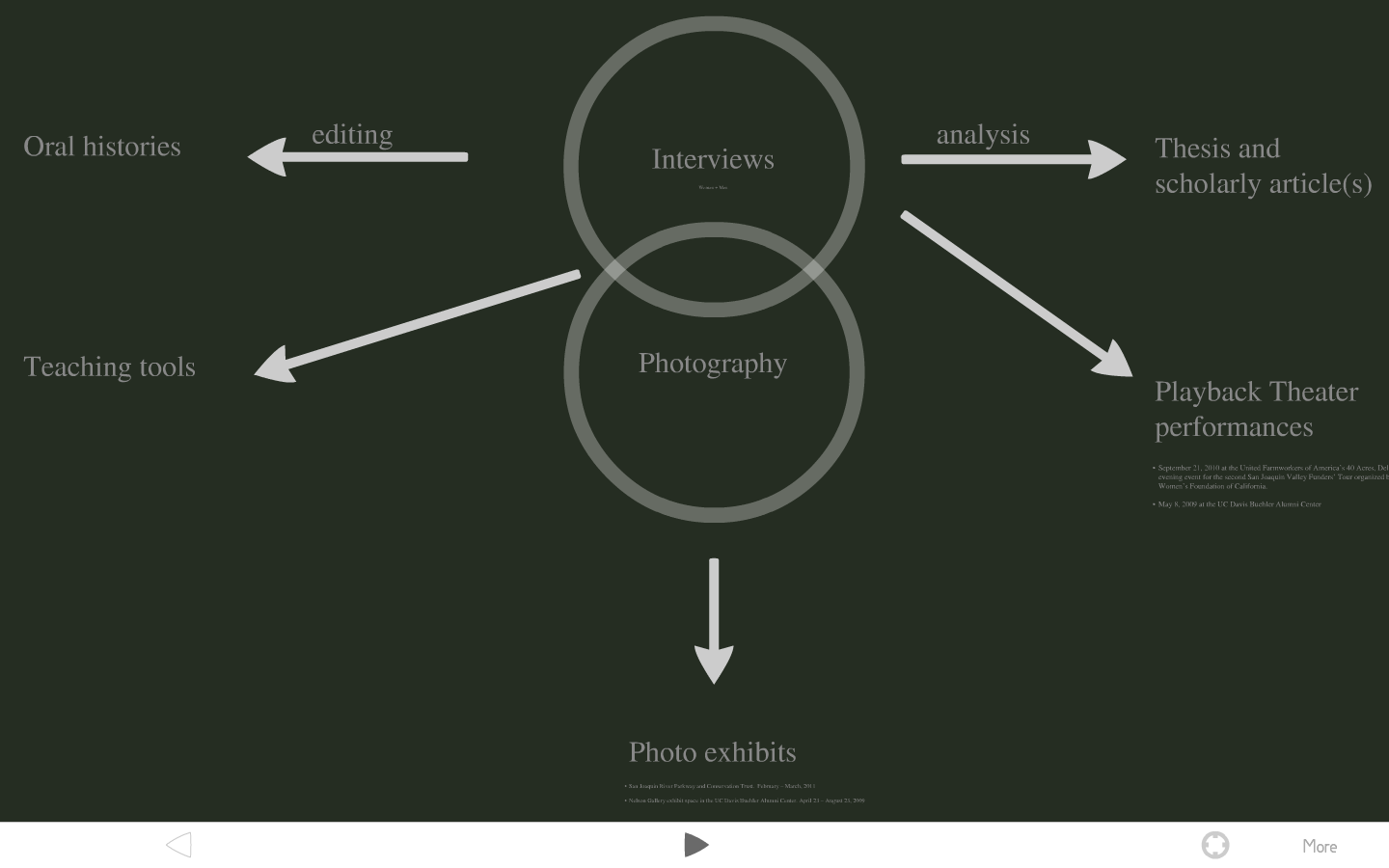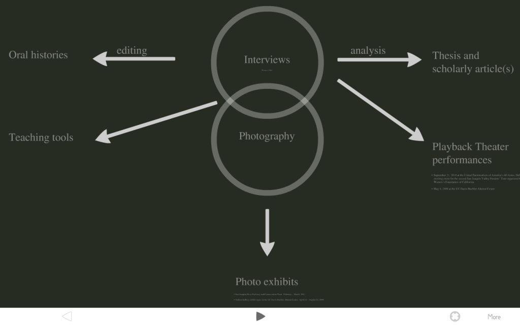 Nonetheless, I was excited to see a different kind of software in action for the first time at a recent conference, and used it in a presentation of my own on Friday.  Prezi let’s you create one big canvas and zoom around on it to focus on different aspects of what you want to say.  Your presentation lives online so you can access it from any computer with an internet connection, and you can e-mail people a link to your presentation for them to view on their own.