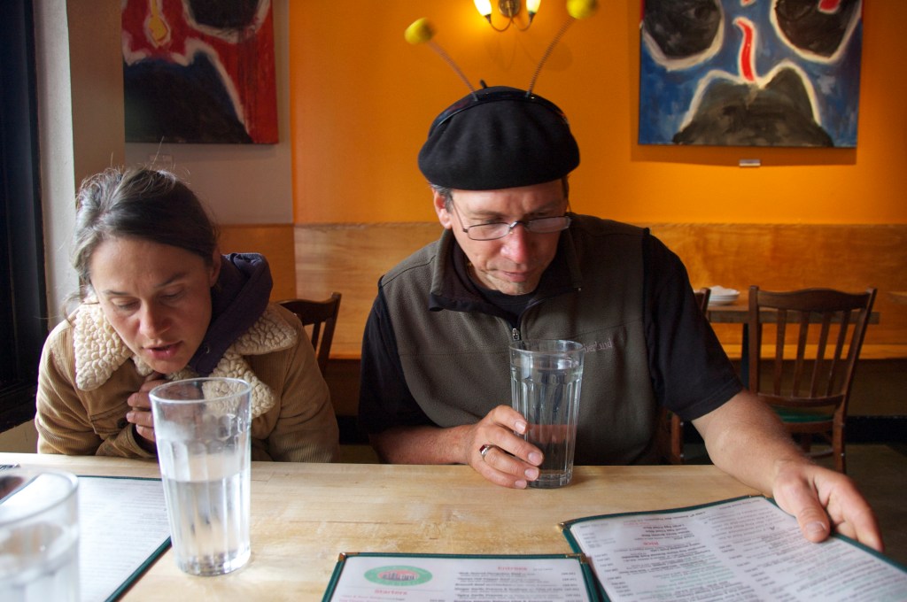 5:30 We take a break to stand around and talk with the helpers.  Then we drive the truck back to the market site, which is once more a parking lot, unload Robert’s stuff into his own car, and find a place to eat.  Teresa talks with her hands a lot.